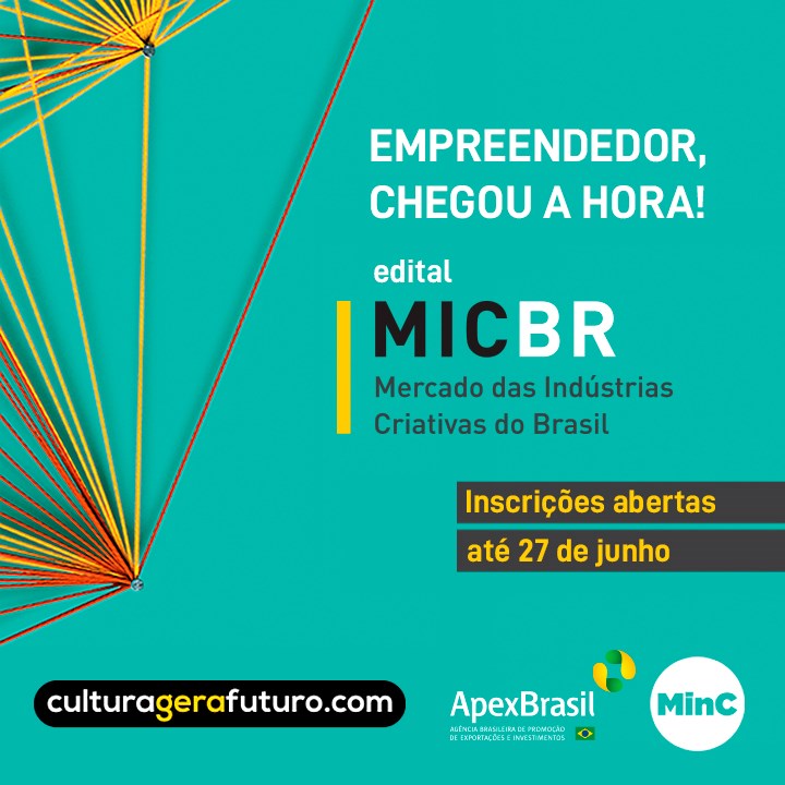 O Ministério da Cultura (MinC) e a Agência Brasileira de Promoção de Exportações e Investimentos (Apex-Brasil) vão apoiar financeiramente a participação de até 180 empreendedores brasileiros na primeira edição do Mercado das Indústrias Criativas do Brasil, o MicBR, megaevento de negócios que vai reunir, em São Paulo, milhares de artistas e empreendedores dos setores culturais e criativos do Brasil e de outros países, em especial os da América do Sul. O aviso de seleção foi publicado nesta segunda-feira (28), no Diário Oficial da União.