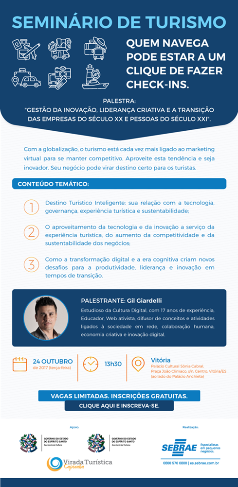 Com a globalização, o turismo está cada vez mais ligado ao marketing virtual para se manter competitivo. Para um negócio do setor ter sucesso, é necessário inovar, afinal, quem navega pode estar a um clique de fazer check-ins. Pensando nisso, o Sebrae, em parceria com a Setur e Secult, realizará o Seminário Empresarial de Turismo, que tratará sobre gestão da inovação, liderança criativa e a transição das empresas do século XX e pessoas do Século XXI. O evento faz parte da Virada Turística Capixaba.